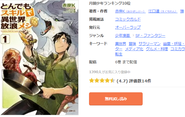 | 【とんでもスキルで異世界放浪メシ】をお得に読めるサービス | ||