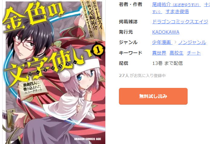 2021年2月6日現在、【金色の文字使い―勇者四人に巻き込まれたユニークチート―】は『全巻無料では読めません』でしたが、